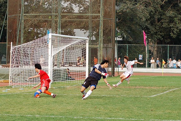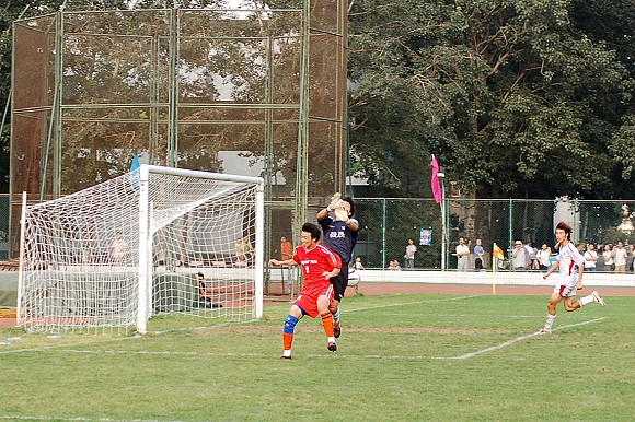 比較剛剛進(jìn)行到第5分鐘,我方球員在對(duì)方禁區(qū)內(nèi)爭(zhēng)頂。