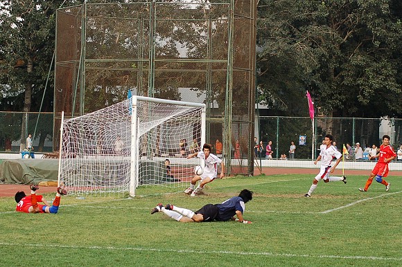 皮球劃過(guò)一道弧線越過(guò)對(duì)方守門員頭頂直入網(wǎng)底。