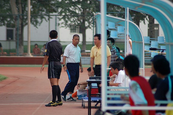 面對(duì)如此的偏袒行為,我校足球隊(duì)總教練金志揚(yáng)也忍耐不住,向第四裁判提出交涉。