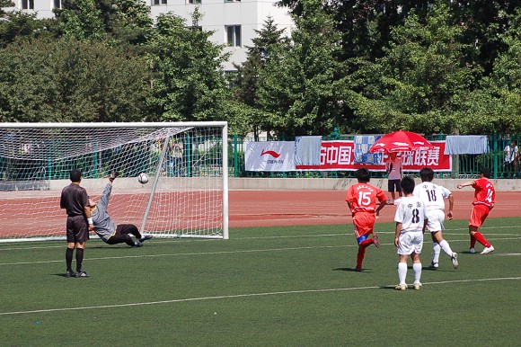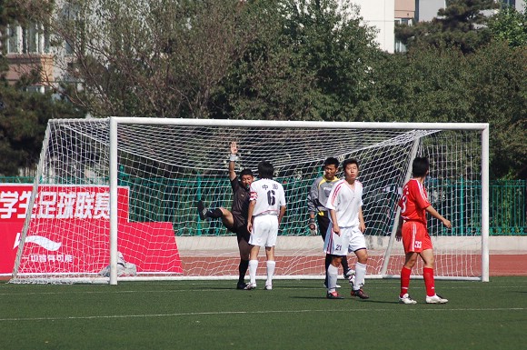 青島大學隊后衛眼見無法阻擋這個勢在必得的進球,只好從后面將袁微放倒在地,不但被裁判紅牌罰下,我隊也獲得了一次點球的機會。點球由上半場的進球功臣王緒主罰,可惜皮球打的太正,被對方守門員的腿部擋出界外,我方失去了繼續擴大比分的機會。