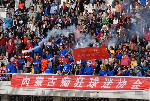 整個上半場,熱情的主場球迷不遺余力的吶喊助威,并多次掀起人浪。第40分鐘,球迷的努力終于得到回報,10號韓德名在禁區混戰中頭球首開紀錄!!
