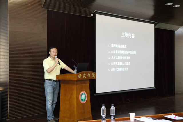 獵聘網(wǎng)首席數(shù)據(jù)官單藝,為大數(shù)據(jù)創(chuàng)新學(xué)習(xí)中心學(xué)員帶來了“人工智能、大數(shù)據(jù)和人才的未來”主題分享,他以獵聘網(wǎng)數(shù)據(jù)展示了大數(shù)據(jù)、機器學(xué)習(xí)、NLP和統(tǒng)計分析的方法對求職招聘相關(guān)的主要問題的研究,分析了人工智能對就業(yè)的可能影響,讓師生體驗到了智能職位推薦、人才推薦和職業(yè)社交推薦的背后大數(shù)據(jù)分析方法和技術(shù)支撐。