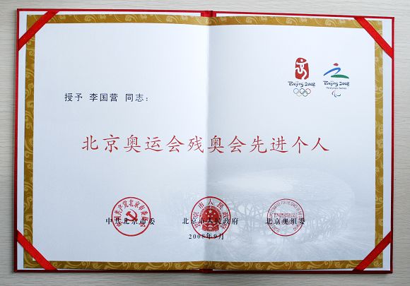 李國營被授予“北京奧運會殘奧會先進個人”榮譽稱號
