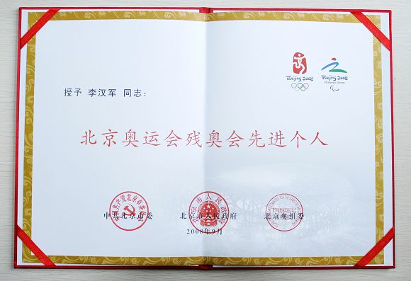 李漢軍被授予“北京奧運會殘奧會先進個人”榮譽稱號