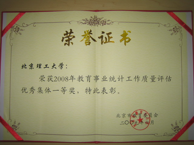 日前,北京市教委召開會議,表彰2008-2009年度北京市教育事業統計工作優秀集體和優秀個人。北京理工大學等6所高校被評為北京市統計工作優秀集體一等獎,北京理工大學桑硼飛同志被評為北京市統計工作優秀個人一等獎。