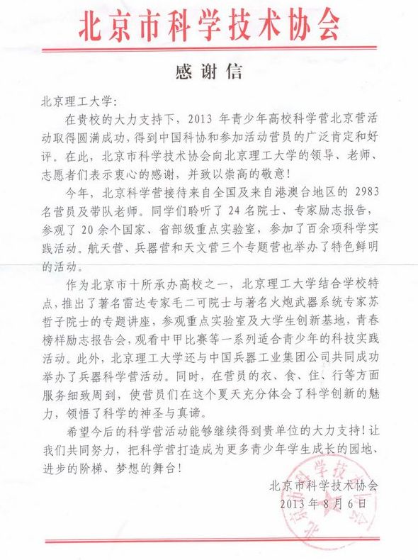 2013年暑期,北京理工大學徐特立科學營在學校辦公室的組織協調下,在校團委、后勤集團等單位大力支持下,經信息與電子學院團委周到細致的工作,取得了圓滿成功。作為青少年高校科學營北京營的主辦單位,北京市科學技術協會特向我校發來感謝信。