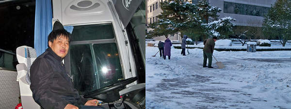 從回龍觀-西三旗發往中關村校區的班車師傅為了不耽誤教職工上班,提前清掃班車,預熱。后勤集團也發動很多工人清掃馬路上的積雪,保障師生員工一路暢通。