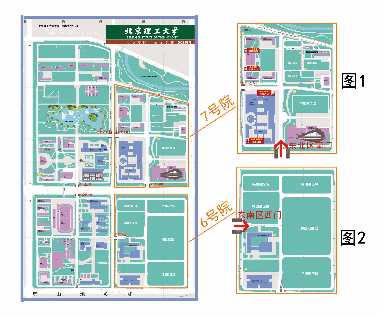 1. 正式啟用良鄉校區東北區南門(良鄉東路7號院校園正門),同時調整文科教學樓組團地下停車庫的出入口(位置如圖1所示),請各位教職工將機動車輛停于地下停車場,地面上主要用于自行車停放。