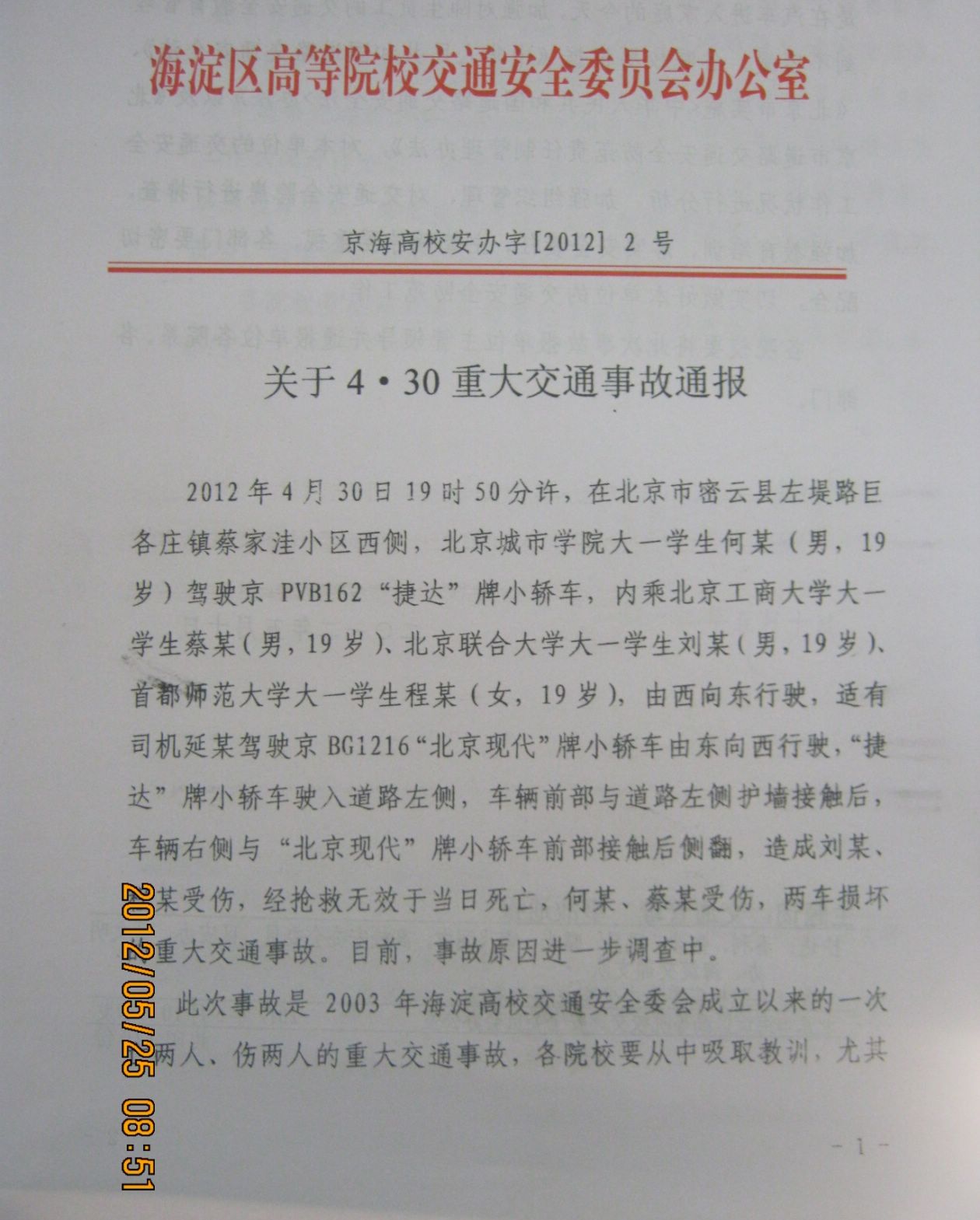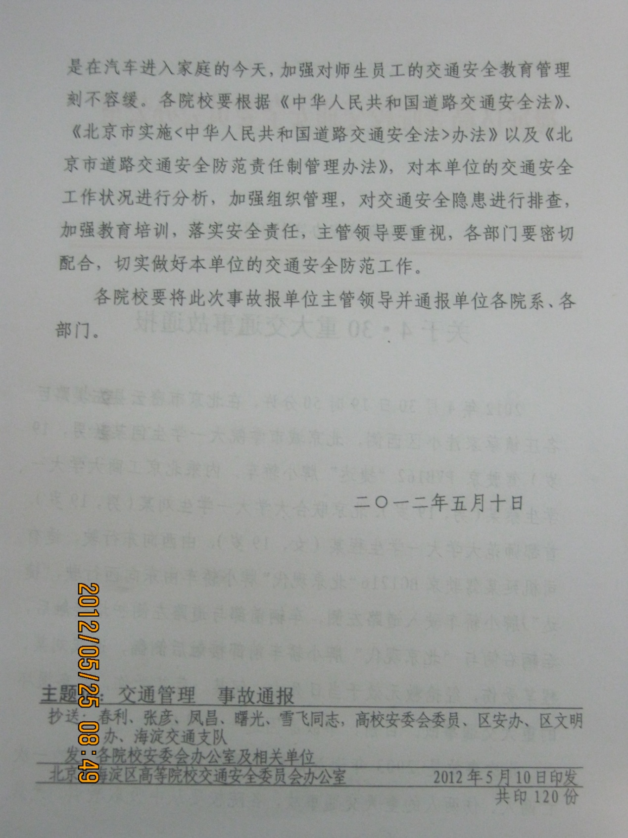 各學院、部、處級單位: 4月30日,在北京市密云縣發生一起重大交通事故,車內所乘4名大學生死亡兩人、重傷兩人,詳情見附件。 請各二級單位,組織所屬師生員工認真學習事故通報,從中吸取教訓,加強所屬人員交通安全教育,遵守交通秩序,杜絕交通陋習,避免交通慘劇發生。
