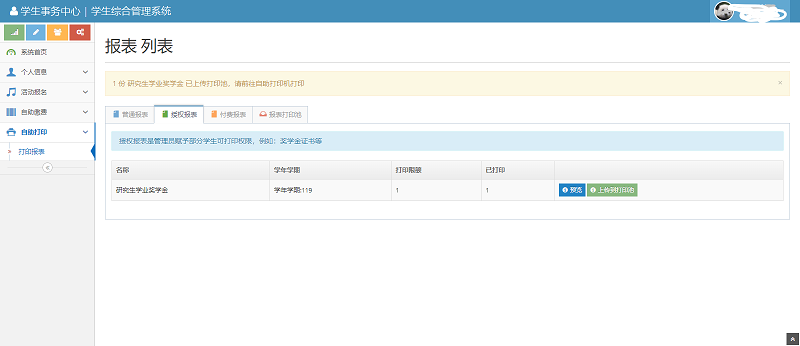 第一步: http://ssc.info.bit.edu.cn/單點登錄,進入如下界面,點擊自助打印——打印報表——選擇要打印的獎項上傳到打印池;