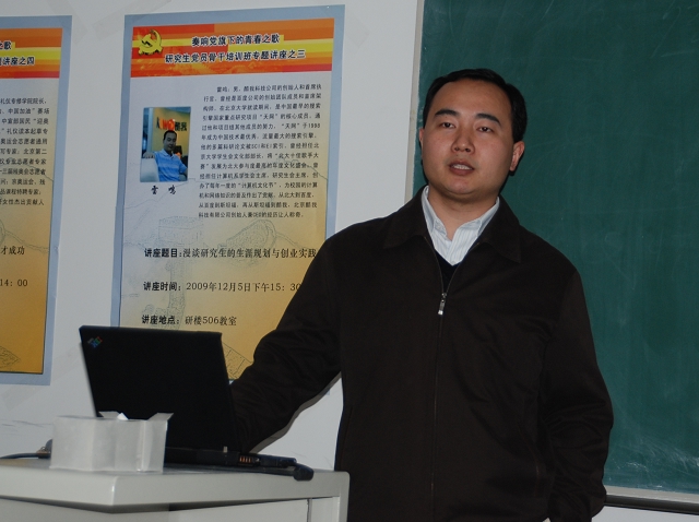 12月5日,繼人格熏陶心理健康講座之后,2009年研究生黨員骨干培訓班迎來了能力講座,本次講座邀請的是酷我科技公司的創始人和首席執行官雷鳴先生。雷鳴先生曾經是百度公司的創始團隊成員和首席構架師,在北京大學就讀期間,是中國最早的搜索引擎國家重點研究項目“天網”的核心成員。