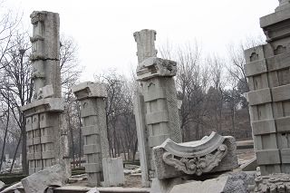 十二獸首展廳,各個獸首,雖然是仿制品,仍然顯得那么的栩栩如生,遺落在海外的兔首和鼠首,期盼早點回歸祖國。在綺春園、福海、長春園,隨處可以看到斷壁殘垣,零落的還帶著雕刻花紋的碎石塊。鑒碧亭、殘橋、風荷樓,也一樣是殘缺不全。昔日的“萬園之園”,在寒冷的冬季更像是一座墳墓,它的雍容華貴早已在侵略者的炮火中消逝。這樣的國恥,如何讓人忘卻?