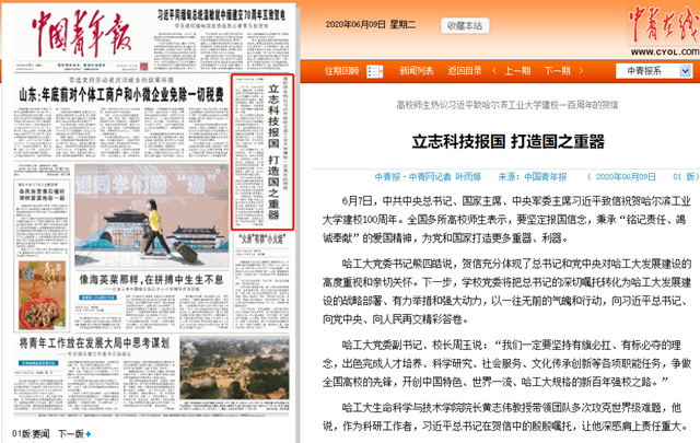 6月7日,中共中央總書記、國家主席、中央軍委主席習近平致信祝賀哈爾濱工業大學建校100周年。全國多所高校師生表示,要堅定報國信念,秉承“銘記責任、竭誠奉獻”的愛國精神,為黨和國家打造更多重器、利器。