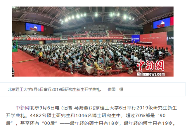 北京理工大學(xué)6日舉行2019級研究生新生開學(xué)典禮。4482名碩士研究生和1046名博士研究生中,超過70%都是“90后”,甚至還有“00后”——最年輕的碩士只有18歲,最年輕的博士只有19歲。