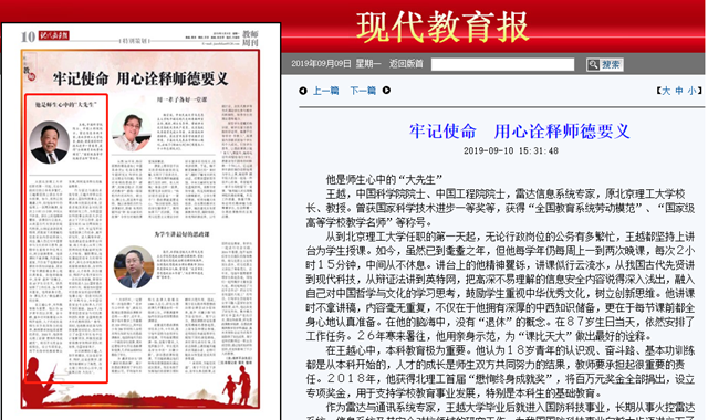學識淵博的王越,人卻平易健談,無論是在學術、科研,還是在教學、管理方面都樹立了典范。在北理工師生的心目中,他是真正的“大先生”。
