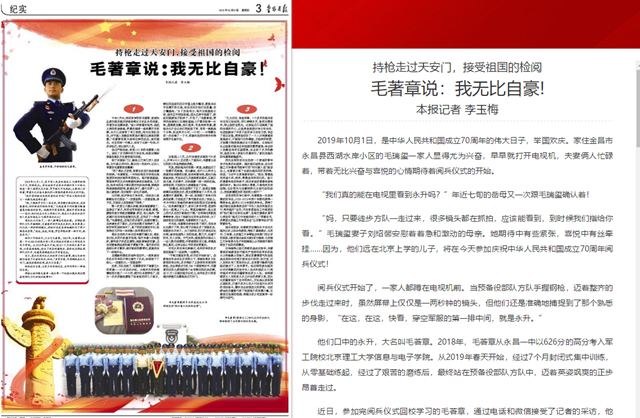 近日,參加完閱兵儀式回校學(xué)習(xí)的毛著章,通過(guò)電話和微信接受了記者的采訪,他說(shuō):“身穿軍裝,手持鋼槍走過(guò)天安門(mén),接受祖國(guó)的檢閱,我無(wú)比自豪。”
