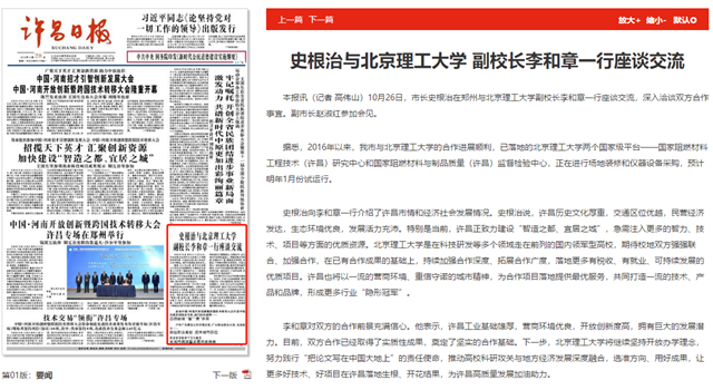 史根治向李和章一行介紹了許昌市情和經濟社會發展情況。史根治說,許昌歷史文化厚重,交通區位優越,民營經濟發達,生態環境優良,發展活力充沛。特別是當前,許昌正致力建設“智造之都、宜居之城”,急需注入更多的智力、技術、項目等方面的優質資源。北京理工大學是在科技研發等多個領域走在前列的國內領軍型高校,期待校地雙方強強聯合、加強合作,在已有合作成果的基礎上,持續加強合作深度、拓展合作廣度,落地更多有稅收、有就業、可持續發展的優質項目。許昌也將以一流的營商環境、重信守諾的城市精神,為合作項目落地提供最優服務,共同打造一流的技術、產品和品牌,形成更多行業“隱形冠軍”。