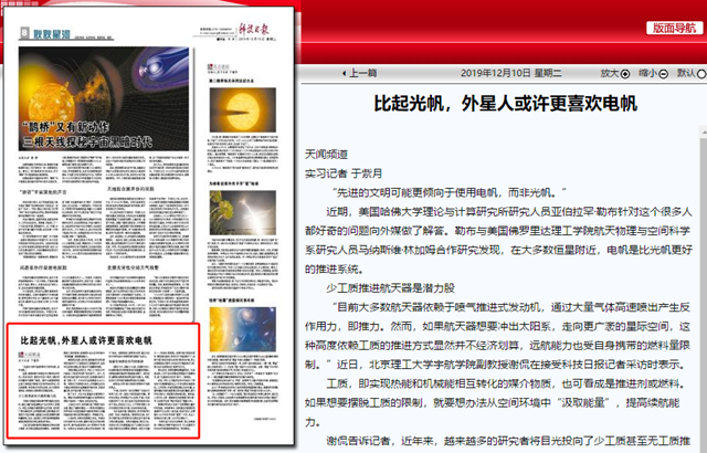 謝侃告訴記者,近年來,越來越多的研究者將目光投向了少工質甚至無工質推進方式,包括早已應用的光帆以及“新生代”的磁帆和電帆。