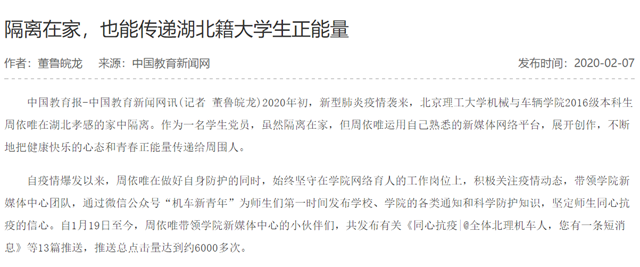 2020年初,新型肺炎疫情襲來,北京理工大學機械與車輛學院2016級本科生周依唯在湖北孝感的家中隔離。作為一名學生黨員,雖然隔離在家,但周依唯運用自己熟悉的新媒體網絡平臺,展開創作,不斷地把健康快樂的心態和青春正能量傳遞給周圍人。