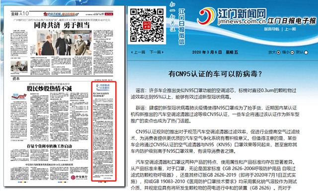 CN95認證規(guī)則的推出對于規(guī)范汽車空調(diào)濾清器過濾效率,促進行業(yè)提高空氣過濾技術,為消費者提供更優(yōu)質(zhì)的汽車空氣凈化系統(tǒng)有著積極意義。但值得注意的是,某些車企將通過CN95認證的空氣濾清器與N95(KN95)口罩效果等同起來,甚至宣稱其車內(nèi)防護級別高于N95口罩效果,有誤導消費者之嫌。