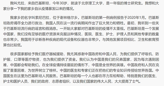 我叫尤拉,來自巴基斯坦,今年30歲,就讀于北京理工大學,是一年級的博士研究生。我想和大家分享一下我的家鄉自從疫情暴發以來的情況。