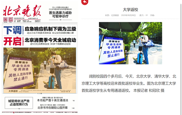 首頁» 新聞網» 媒體北理» 媒體理工 大學返校 發布日期: 2020-06-08 供稿:北京晚報 編輯:吳楠 審核:劉曉俏 閱讀次數: 原文標題:大學返校 原文鏈接:http://bjwb.bjd.com.cn/html/2020-06/06/content_12465352.htm 闊別校園四個多月后,今天,北京大學、清華大學、北京理工大學等高校迎來首批返校畢業生。圖為北京理工大學首批返校學生從專用通道返校。 分享到: 最新新聞 精彩推薦