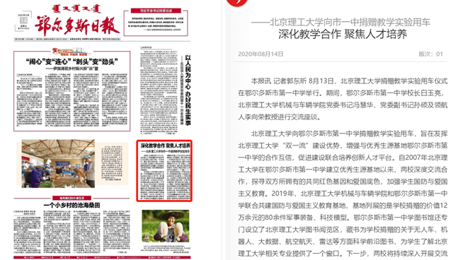 北京理工大學向鄂爾多斯市第一中學捐贈教學實驗用車,旨在發揮北京理工大學“雙一流”建設優勢,增強與優秀生源基地鄂爾多斯市第一中學的合作互信,促進建設聯合培養創新人才平臺。自2007年北京理工大學在鄂爾多斯市第一中學建立優秀生源基地以來,兩校深度交流合作,探尋雙方所擁有的共同紅色基因和愛國底色,加強學生國防與愛國主義教育。2019年,北京理工大學機械與車輛學院和鄂爾多斯市第一中學聯合共建國防與愛國主義教育基地,基地列展的是學校捐贈的價值12萬余元的80余件軍事裝備、科技模型。鄂爾多斯市第一中學圖書館還專門設立了北京理工大學圖書閱覽區,藏書為學校捐贈的關于無人車、機器人、大數據、航空航天、雷達等方面科學前沿圖書,為學生了解北京理工大學相關專業提供了一個窗口。下一步,兩校將持續深入開展交流合作,共同探索協同育人為祖國與社會培養拔尖創新型人才教育模式。北京理工大學知名學者、教授每年到鄂爾多斯市第一中學開展北理講堂、學科前沿學術講座,設立“領航人”李向榮、薛敏老師等學校優秀教師隊伍將定期到鄂爾多斯市第一中學與學生座談,交流學校學科介紹、學生生涯發展等。鄂爾多斯市第一中學的優秀學生還可以在寒暑期前往北京理工大學參觀學校校區、實驗室等,深度近距離了解學校辦學特色和科研學科優勢。