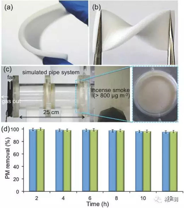 圖3 ZIF-8@密胺泡沫的柔性展示和去除 PM 性能測試