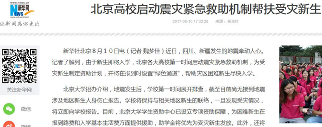 北京理工大學也及時啟動了自然災害地區學生緊急救助機制。據該校介紹,經初步排查,學校2017級本科新生中僅有一名來自阿壩州的學生,家中未受災。目前,學校的排查工作仍在緊張開展中,不僅覆蓋全體新生和在校生,還將加強對地震受災州縣周邊區域生源的關注。按照應急預案,該校將對受災新生提供來校路費及助學金,并將對其制定專門的資助計劃,在開學當日發放臨時助學資金。