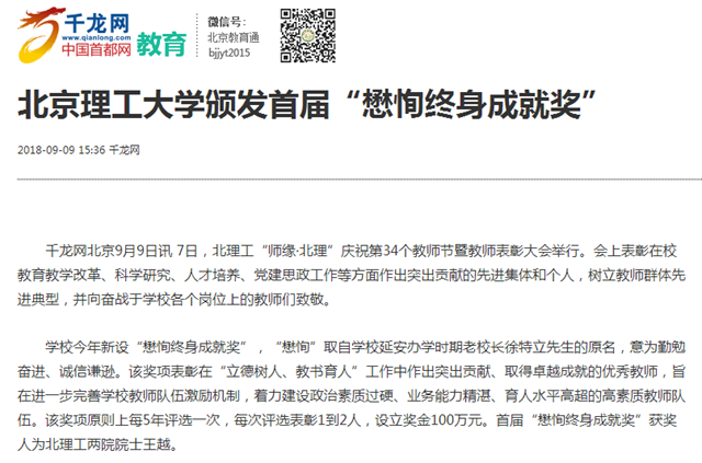 在第34個教師節到來之際,中國科學院院士、中國工程院院士、著名雷達與通迅系統專家王越獲得北京理工大學今年首次設立的人才培養工作最高榮譽“懋恂終身成就獎”。