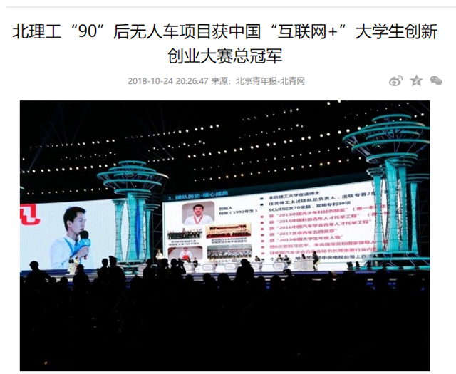【北青網】北理工“90”后無人車項目獲中國“互聯網+”大學生創新創業大賽總冠軍