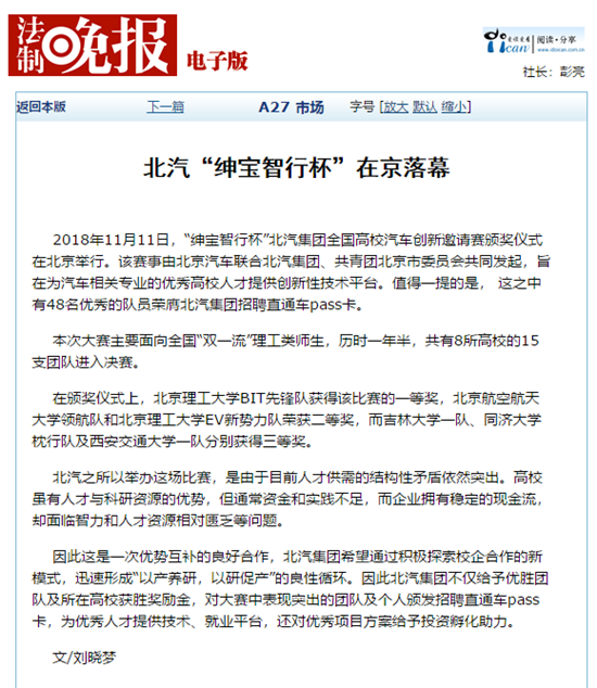 【法制晚報】北理工獲得北汽“紳寶智行杯”比賽一等獎