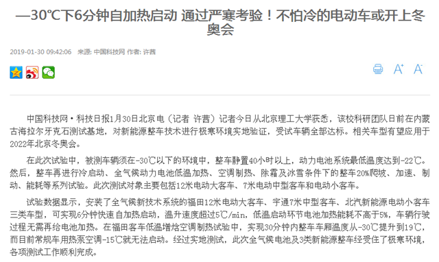 【中國科技網】—30℃下6分鐘自加熱啟動通過嚴寒考驗!不怕冷的電動車或開上冬奧會