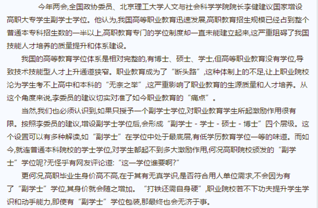 當然,我們也必須認識到,如果只授予一個副學士學位,對職業教育學生所起激勵作用很有限。按照李委員的建議,增設副學士學位后,會形成“副學士-學士-碩士-博士”四個層級。這個設置可以有多種解讀,如“副學士”在學位中處于最底層,有低學歷教育學位一等的味道。而如今,就連普通本科院校的學士學位,對學生都起不到多大激勵作用,何況高職院校頒發的“副學士”學位呢?無怪乎有網友評論道:“這一學位誰要啊?”