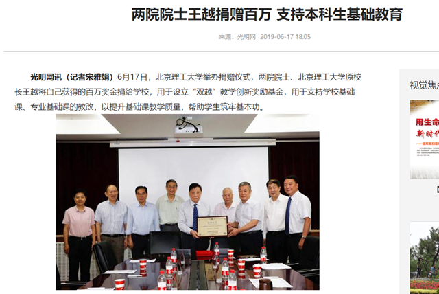 6月17日,北京理工大學舉辦捐贈儀式,兩院院士、北京理工大學原校長王越將自己獲得的百萬獎金捐給學校,用于設立“雙越”教學創新獎勵基金,用于支持學校基礎課、專業基礎課的教改,以提升基礎課教學質量,幫助學生筑牢基本功。