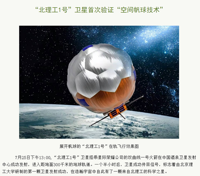 【科學網】“北理工1號”衛星首次驗證“空間帆球技術”