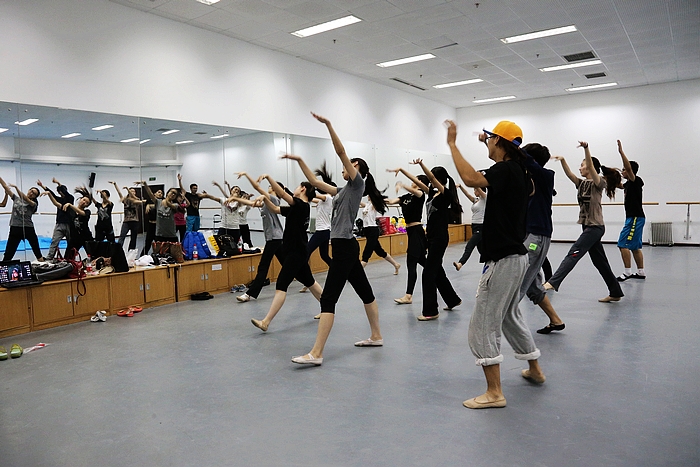 “臺上一分鐘,臺下十年功。”華麗轉身的背后是教練和隊員們汗水的澆注。隊員們的每一套動作需要長時間地去抓細節,為了做到完美,要一點一點地對著鏡子去反復練習。在不耽誤學業的情況下,隊員們要保證3-6個小時的排練時間,減肥在這些隊員中永遠不是問題,因為在高強度的排練下體重會自然下降。訓練初期,由于時間比較緊張,排練的場地無法保障,為了保證訓練時間,隊員們便在籃球場等地練劈叉、練大跳,硬邦邦的塑膠地一次次地考驗著隊員們的意志,渾身的淤青也沒有阻擋他們埋頭訓練的決心。