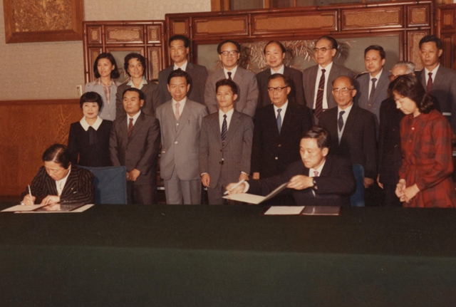 (1986年在人民大會堂,朱鶴孫校長與日方簽署中國工程技術人員赴日研修協議)