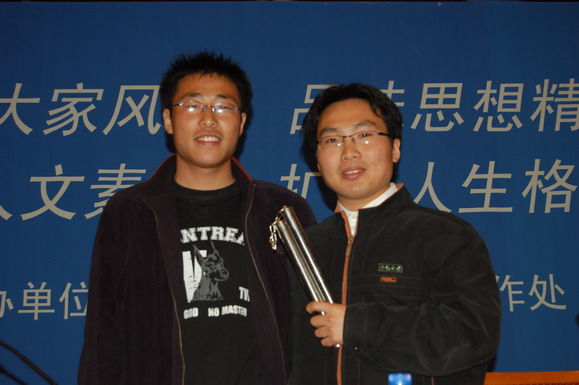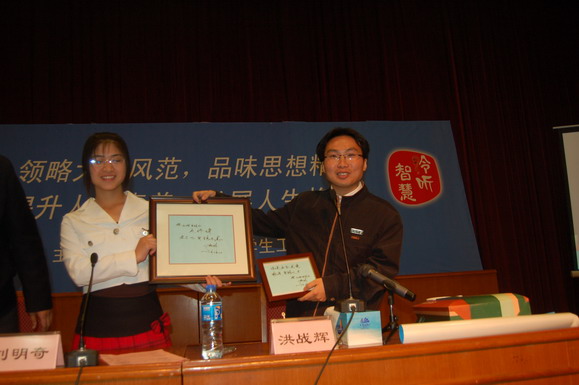 學生工作部部長劉明奇代表學校把一些具有學校特色的紀念品和講座的海報贈送給了洪戰輝同學。同時,洪戰輝同學也為我校自強社準備了一份小禮物。由他親筆題寫的一幅硬筆書法作品,內容是“天行健,君子以自強不息 與北京理工大學自強社同學共勉”