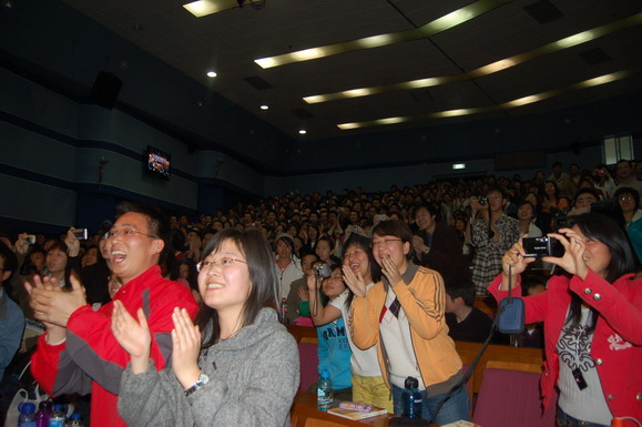 為了給更多同學(xué)互動(dòng)提問的機(jī)會(huì),章老師把演講的時(shí)間進(jìn)行了壓縮,留出了近一個(gè)小時(shí)的時(shí)間回答同學(xué)們的問題。在解釋為什么孫悟空差點(diǎn)讓天庭亡國(guó),卻打不過手下敗將的坐騎時(shí),章老師解釋道:“這正是吳承恩對(duì)封建主義和官僚作風(fēng)的批判,不管是什么精呀怪的,人家‘上面有人’,在被孫悟空殺死之前,必然會(huì)出現(xiàn)個(gè)什么佛呀仙呀的要求大圣手下留情,是吳承恩當(dāng)時(shí)寫書時(shí)希望表達(dá)的一種不滿。”在被問及如何看待緊箍咒時(shí),章老師說:“孫悟空在取到真經(jīng)后問菩薩‘我頭上的緊箍咒能取下了么?’菩薩說‘你自己看看’結(jié)果孫悟空一摸,嘿嘿,沒了!能自己約束自己了,這緊箍咒也就不需要了。”接著他又耐心細(xì)致地回答了“西方人如何看待西游記和孫悟空?”、“您女兒會(huì)成為第一個(gè)女美猴王么?”、“為什么西游記中會(huì)有三個(gè)唐僧?”、“您會(huì)像成龍一樣海選接班人么?”等問題。
