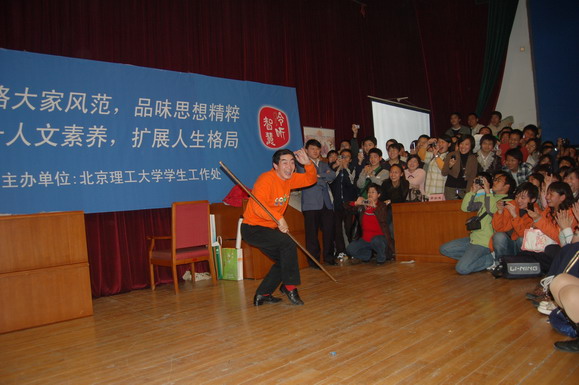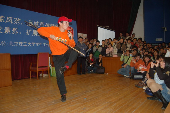 在回答完同學(xué)的問題后,章老師在現(xiàn)場(chǎng)進(jìn)行了即興表演,他一手握著“金箍棒”做出一個(gè)個(gè)經(jīng)典的動(dòng)作,一個(gè)手拿著話筒向同學(xué)們仔細(xì)的講解動(dòng)作的要領(lǐng),并和錯(cuò)誤的動(dòng)作進(jìn)行了對(duì)比分析,讓同學(xué)們領(lǐng)悟到了看似簡(jiǎn)單的一招一式中蘊(yùn)含的奧妙和學(xué)問。最后章老師向所有聽眾展示了一套完整的連續(xù)動(dòng)作,霎時(shí)間只見金棒飛舞、虎虎生風(fēng),配以《西游記》中的經(jīng)典音樂,章老師的風(fēng)采絲毫不減當(dāng)年,儼然是“齊天大圣”從天而降。全場(chǎng)觀眾起立為章老師報(bào)以長(zhǎng)時(shí)間的熱烈掌聲。