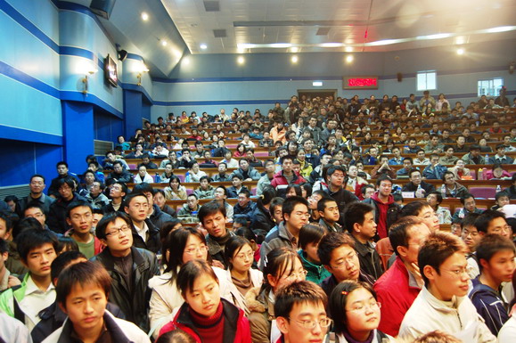 學生工作部早在報告會開始一周前就通過網站、論壇、海報、噴繪等多種形式對本次報告會展開了大規模宣傳,使這場報告會受到了同學們的廣泛關注。在報告會開始前6個小時就有同學來到會場等候,報告會開始前一個小時所有座位都坐滿了觀眾,過道和講臺上都擠滿了熱情的聽眾。