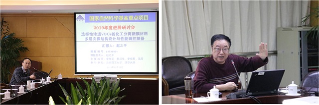 項目負責人北京理工大學趙之平教授對與會各位專家表示熱烈歡迎,衷心感謝各位研究骨干這一年來對項目進展所作出的努力。趙之平教授分別從項目總體研究方案、本年度進展、存在問題及解決方案和下一步工作計劃四個方面對2019年度工作情況做了總體匯報,并介紹了團隊這一年來開展的主要工作以及取得的階段性成果。清華大學李繼定教授將荷葉疏水機理應用于滲透汽化膜,研究OPS、POSS、MOFs等添加劑對混合基質膜性能的影響以及MOFs對噻吩、正庚烷的吸附和擴散行為。李歡軍副教授團隊和黎漢生副教授團隊碩士研究生分別以“基于超疏水表面構筑滲透汽化膜制備及性能研究”“嵌段共聚物分離膜制備及甲醛廢水處理”“雙膜法分離甲醛水溶液”為題介紹了各自團隊這一年來的工作進展情況。