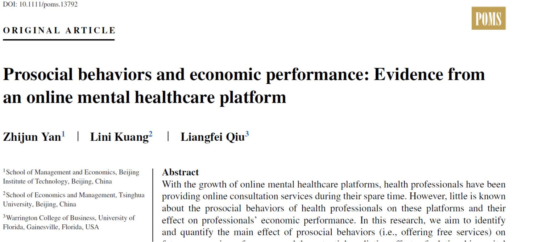 論文鏈接:Yan, Z., Kuang, L., & Qiu, L. (2022). Prosocial behaviors and economic performance: Evidence from an online mental healthcare platform. Production and Operations Management, 31, 3859– 3876. https://doi.org/10.1111/poms.13792