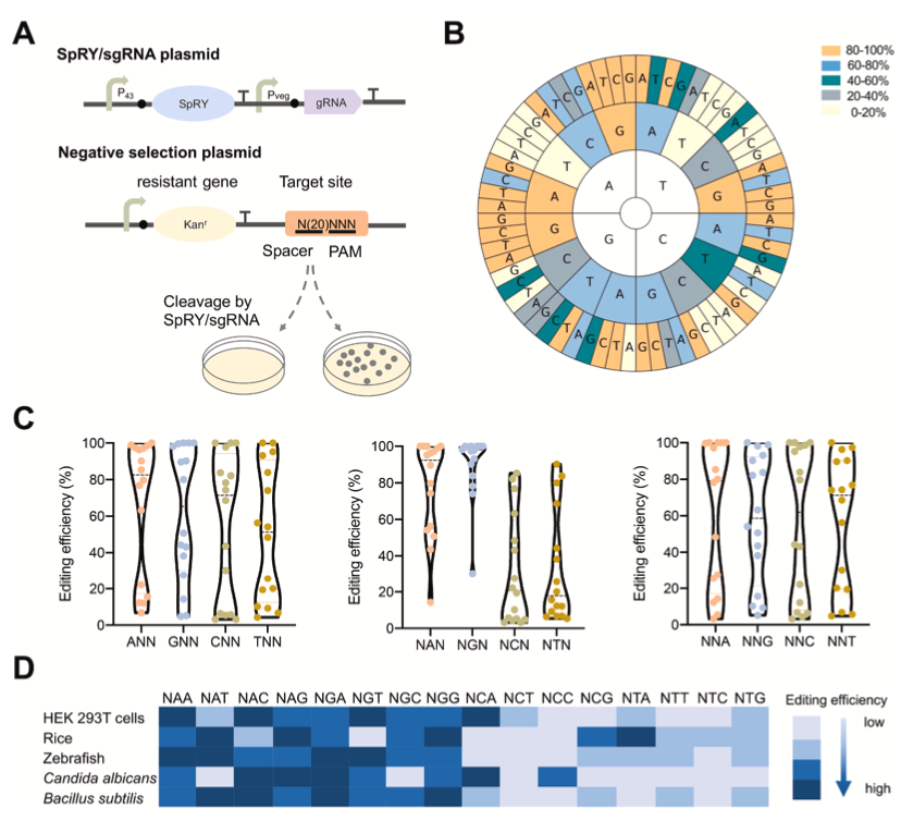 論文對Cas9突變體SpRY的識(shí)別范圍進(jìn)行了系統(tǒng)掃描,發(fā)現(xiàn)不同物種中SpRY的PAM位點(diǎn)具有不同的偏好性。通過建立無偏差的PAM位點(diǎn)識(shí)別評估系統(tǒng),確定了枯草芽胞桿菌中SpRY最偏好的位點(diǎn)為NGG、NGA、NAT和NAC,最不偏好的位點(diǎn)為NCC、NCT、NTC和NTA。利用枯草芽胞桿菌中SpRY的PAM識(shí)別特異性信息,我們可以在基因組編輯過程中挑選出高活性的PAM位點(diǎn),同時(shí)避免使用效率低下的位點(diǎn)(圖二)。