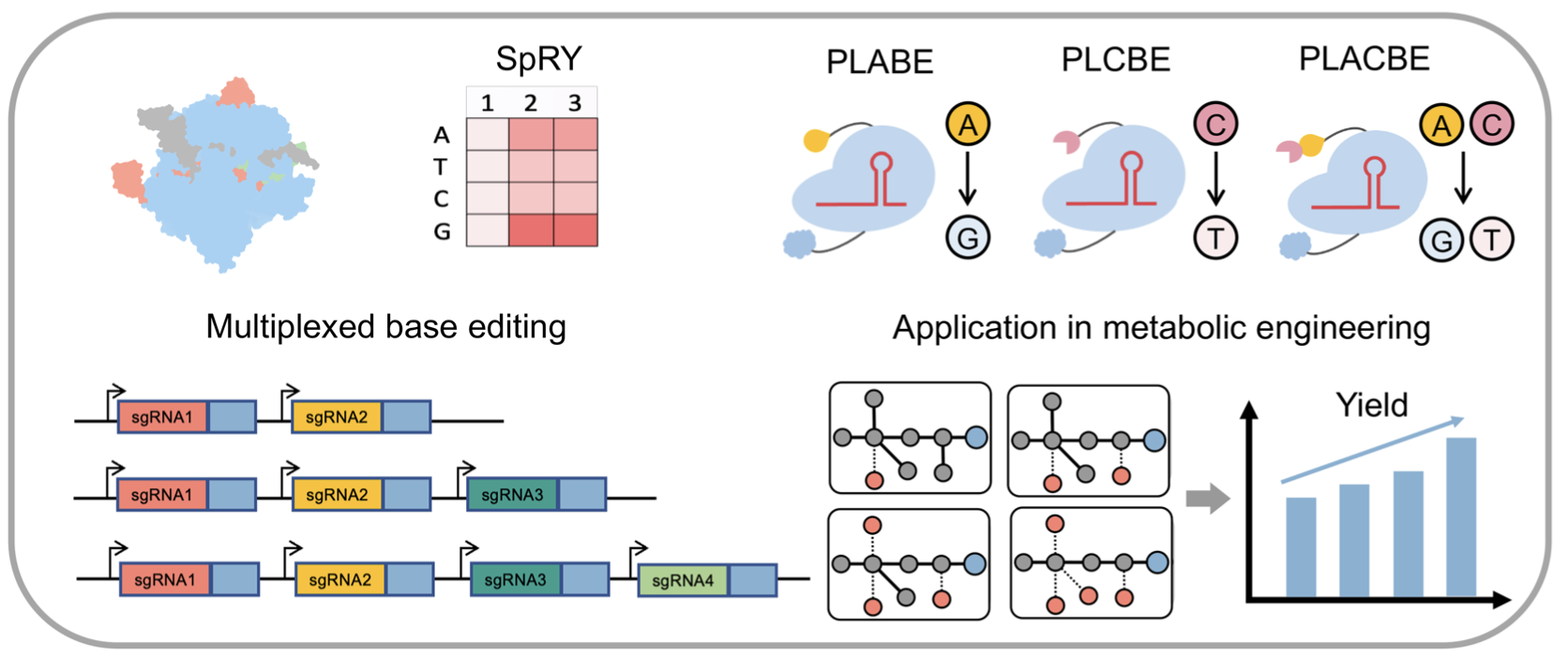 CRISPR/Cas9介導(dǎo)的堿基編輯器已經(jīng)成為了一種強(qiáng)大的基因組編輯工具,并廣泛應(yīng)用于代謝工程等領(lǐng)域。堿基編輯器可以提前引入終止密碼子,產(chǎn)生點(diǎn)突變,調(diào)節(jié)基因表達(dá)水平,改造蛋白質(zhì)序列以及構(gòu)建底盤突變庫等。然而,堿基編輯器對特定PAM的識(shí)別需求限制了其作用范圍和編輯靈活性。為此,團(tuán)隊(duì)首次在枯草芽胞桿菌中建立了無PAM限制的(PAM-less)的PLABE、PLCBE以及PLACBE堿基編輯工具箱,成功實(shí)現(xiàn)了基因組上任意A/C位點(diǎn)的編輯。同時(shí),建立了PAM-less多靶點(diǎn)堿基編輯技術(shù),并將其應(yīng)用于代謝工程改造,通過一次構(gòu)建產(chǎn)生16種突變菌株的組合,成功將化學(xué)品乙偶姻的產(chǎn)量提高了26.3 %(圖一)。