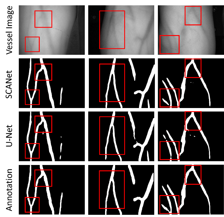 紅外靜脈血管穿刺技術(IR-Venipuncture)是利用近紅外光學儀器進行皮下血管自動成像,實現智能紅外靜脈血管穿刺的技術。然而,紅外靜脈血管智能識別和分割是此項技術的瓶頸難題。針對這一科學難題,科研團隊首次以血管分割效果和運行效率為雙準則,提出了基于半監督學習的全自動近紅外靜脈語義分割模型SCANet,突破了這一關鍵技術。