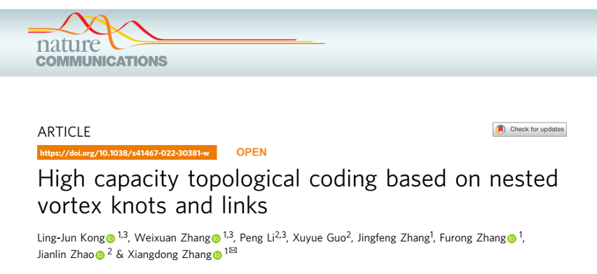 日前,北京理工大學物理學院張向東教授課題組和西北工業大學物理科學與技術學院的趙建林教授課題組合作,在基于嵌套紐結結構高容量拓撲編碼研究方面取得重要進展。相關研究成果發表在近期的Nature Communications上,研究工作得到了國家自然科學基金委和國家重點研發計劃的資助。北京理工大學物理學院孔令軍研究員,張蔚暄博士(現集成電路與電子學院特立博士后)和西北工業大學的李鵬副教授為論文的共同第一作者。