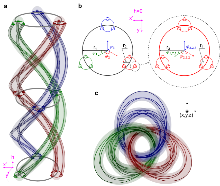 首先,研究人員理論設計了具有多拓撲不變量的嵌套式紐結結構。圖1顯示了構建嵌套式紐結的示意圖。其中,圖1a是該嵌套式紐結的辮子表示,它包含了由綠色、紅色和藍色標記的三類不同層級的零點線。為了更清楚地顯示嵌套紐結的層級結構,圖1b展示了起始端面的放大圖。從中我們可以看到,半徑為 r 1的第一代辮子由綠色、紅色和藍色標記的三條第二帶辮子編織而成。同時,三條半徑為 r 2的第二代辮子是由半徑尺寸更小的第三代辮子編織而成。而半徑為 r 3的第三代辮子是由半徑為 r 4的第四代辮子編織而成。通過上述嵌套式的編織方式,最終具有分形幾何結構的嵌套紐結可以被構建出來。如圖1c所示,通過將圖1a中辮子的起始端平面和終點端平面收尾相連,可以實現由四代辮子組成的嵌套紐結結構。由于這一新型的紐結結構具有分形式的嵌套結構,研究者稱其為嵌套紐結(nested knots)。嵌套紐結這一概念的提出,是對紐結理論的拓展。
