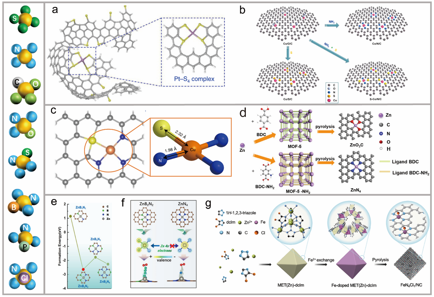 根據配位化學和晶體場理論,與中心活性金屬直接配位的原子可以對整體催化位點產生特定而顯著的作用。由于中心金屬位通常配位4個原子(通常配位為d-p σ-鍵),其鍵能或局域電子結構由第一個配位原子決定。